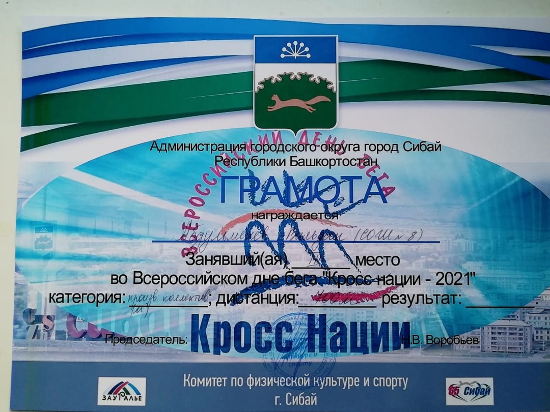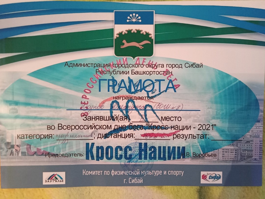 Сегодня прошли соревнования "Кросс Нации -2021", где наши учащиеся и педагоги школы приняли активное участие.В результате ученица 11 класса Бураншина Ильина заняла 1 место среди девушек 10-11 классов, учителя физической культуры Якупов Юмагужа Фанилевич занял 2 место, Абдульменев Вильдан Ильдарович призовое 3 место! Так держать!!!